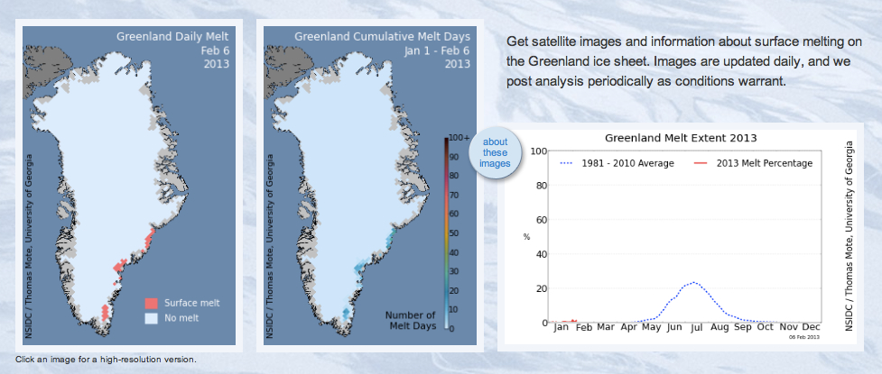The NSIDC is also hosting a series of stunning animated NASA satellite images that illustrate the changing nature of Arctic snow cover, vegetation and frozen ground as well as sea ice extent. The frozen ground page has this inset chart showing the general thaw (click for larger image):
