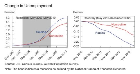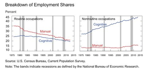Hmmm. It is true that jobs have risen in the high-end cognitive occupations, but the rise in low-wage manual occupation job growth has been minimal, and far too small to absorb the displaced middle.We can see these numbers in a 2013 note from the Federal Reserve Bank of New York by Albanesi et al. Indeed, the job polarisation highlighted by Autor is impacting on the aggregate labour market beyond just relative wages. First, both cognitive routine and manual routine jobs have been in structural decline: