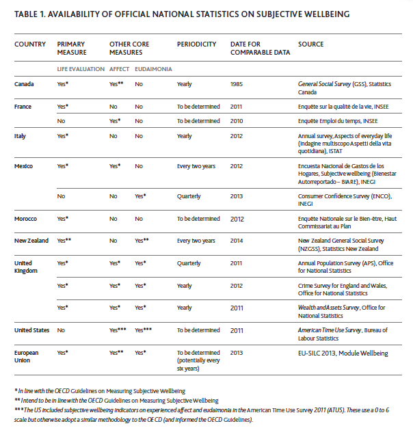 These three categories provide a very rich metric for measuring differing aspects of happiness, and each of these three categories has its own nuances and idiosyncrasies. Nonetheless, the job of national statistical offices is one of trade-offs: complex questionnaires have a price, both in return rates and the cost to complete and process. The trick is to produce the minimum number of necessary questions that are both simple yet not naive. The Organisation of Economic Cooperation and Development (OECD) has come up with a set of core measures of subjective welling: