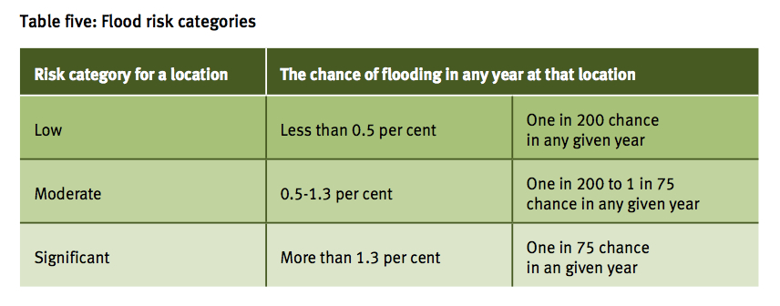 • Significant risk: the chance of flooding in any year is greater than 1.3 per cent (1 in 75)