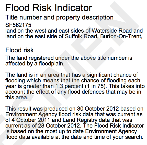 Fortunately, a risk assessment (called the Flood Risk Indicator, a description of which can be found here) based on NaFRA became available to the general public in 2009 through the Land Registry here and and costs £9 (although you can actually get the same information for free by contacting the EA directly). An example is below: