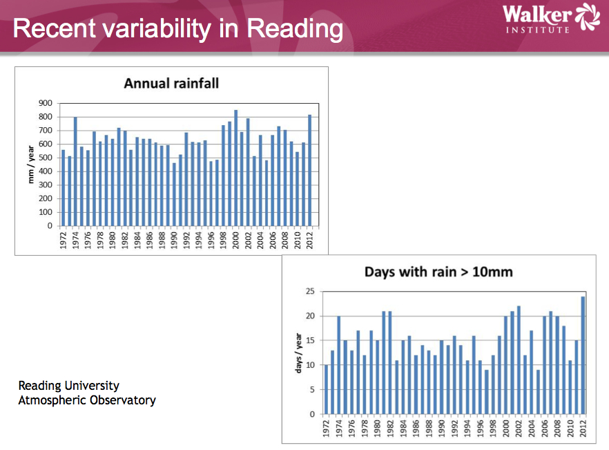 Last week I attended an evening of talks given under the title “Extreme Weather and Floods” and hosted by the local sustainability group PAWS in the Thames side village of Pangbourne. The speakers were Professor Nigel Arnell,  Director of the Walker Climate Institute, Reading University, and Stuart Clarke, Principal Engineer and the senior officer for flood risk management at West Berkshire Council.