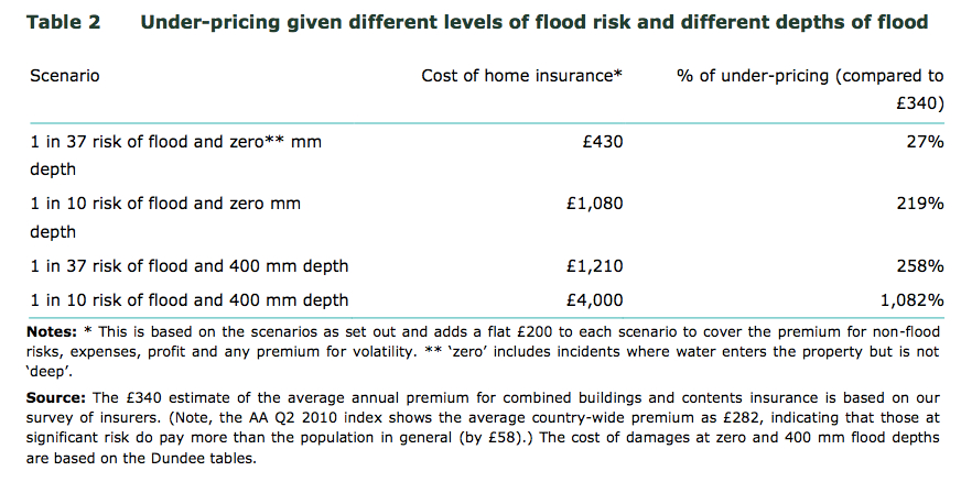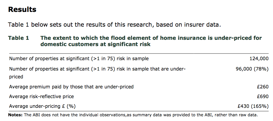 The analysis above has an interesting hole: if ‘significant’ risk properties are being underpriced insurance premium-wise, then other properties are being overpriced. The £430 in the first table has to go somewhere, either as a burden on other property holders or as a drag on insurance company profits. Note also that the 124,000 properties are a sample, not the actual population of insured significant risk properties.