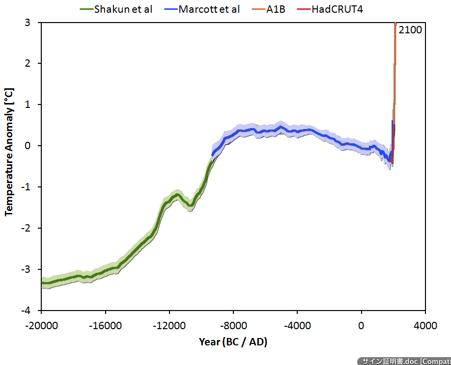 This applies to absolutely every single economic, financial and social relationship that has been forged in the modern era. The climate is undergoing a step change away from that of the holocene—under which civilisation was founded, took root and spread—to the human-generated climate of the anthropocene. The chart below, from Bart Verheggen’s blog, shows predicted temperature change set against the background of the temperature of the last 20,000 years (back to the last ice age). Message for flood prone home owners: you ain’t seen nothing yet.