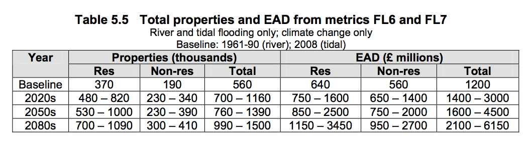 Fortunately, the UK government’s Department for the Environment, Food & Rural Affairs (DEFRA) published a report entitled Climate Change Risk Assessment (CCRA) in 2012. In the section entitled “Climate Change Risk Assessment for the Floods and Coastal Erosion Sector” we see these numbers: