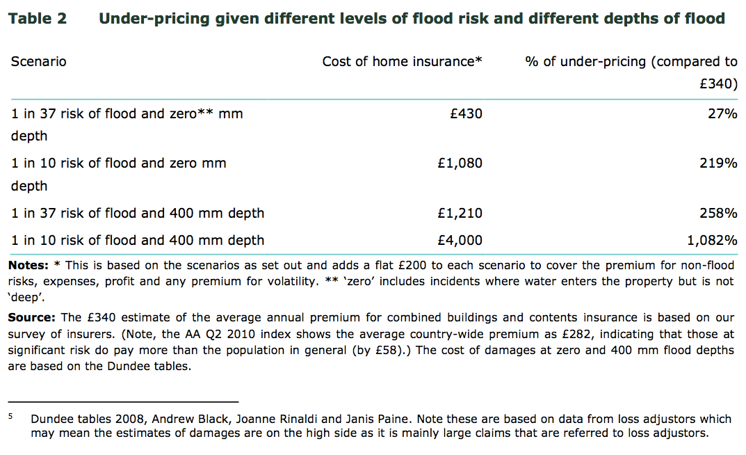 The border line between capitalism ‘red in tooth and claw’ and the socialization of risk is a one-in-75 year flood event (a 1.3% chance of flooding in an individual year). If you are in a flood zone which is estimated to have a flood risk greater than one in 75 years and the government has no plan to beef up flood defences over the next 5 years, then ‘tough’—you have to make an accommodation with Mr. Market. If—like Mr. Angry of Pangbourne above—Mr. Market’s quote is in the stratosphere, then you may be forced to turn it down and go uninsured. Note that if your property was built after 1 January 2009, it automatically falls outside of this agreement between the insurers and the government.